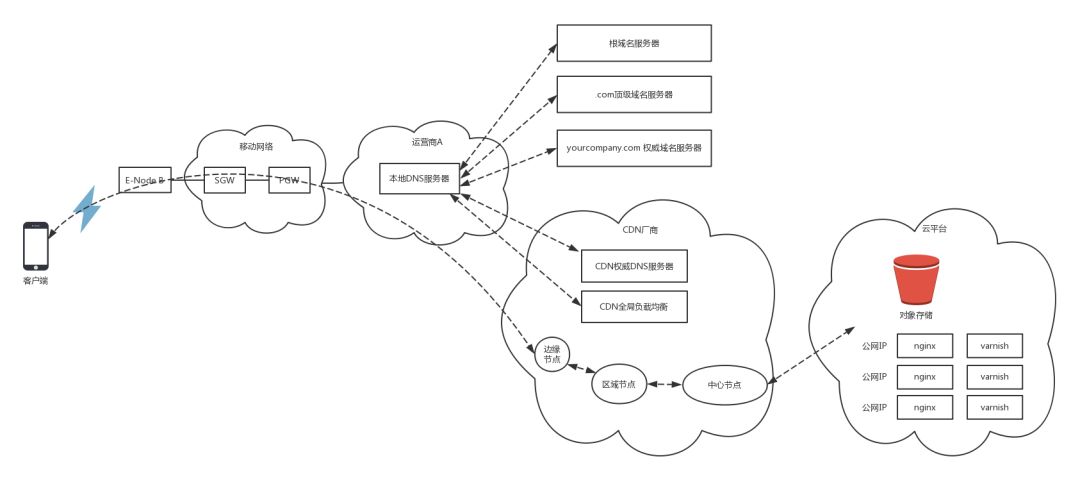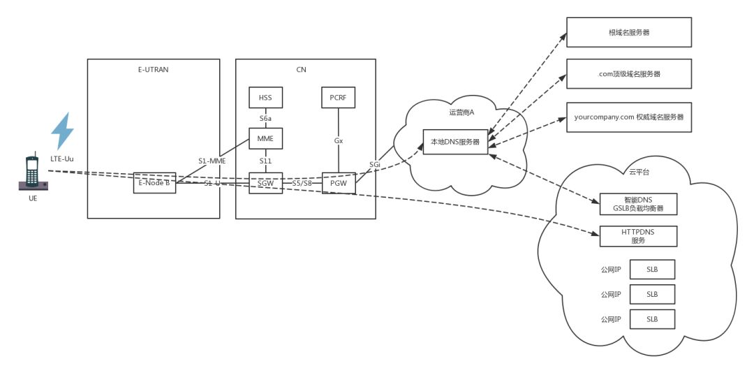 在手机运营商所在的互联网区域里,有一个本地的DNS,手机会向这个DNS请求解析DNS。当这个DNS本地有缓存,则直接返回;如果没有缓存,本地DNS才需要递归地从根DNS服务器,查到.com的顶级域名服务器,最终查到权威DNS服务器。