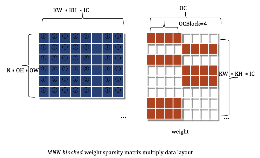 为了适配SIMD优化,MNN通过权重矩阵稀疏化设计,训练合适的稀疏化分布,使权重矩阵呈现出“半结构化”稀疏的特性,而不是在行、列方向完全随机化稀疏,避免了向量vector用不满、数据复用低的弊端。如下图所示的BCSR(Block Compressed Sparse Row ) 格式: