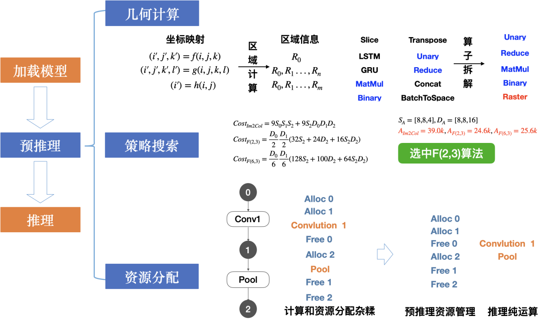 MNN 在加载模型之后,会根据用户设定的输入形状,对模型中的算子做一遍预处理,降低算子种类,寻找最优计算策略,做资源分配。这个过程称为预推理。