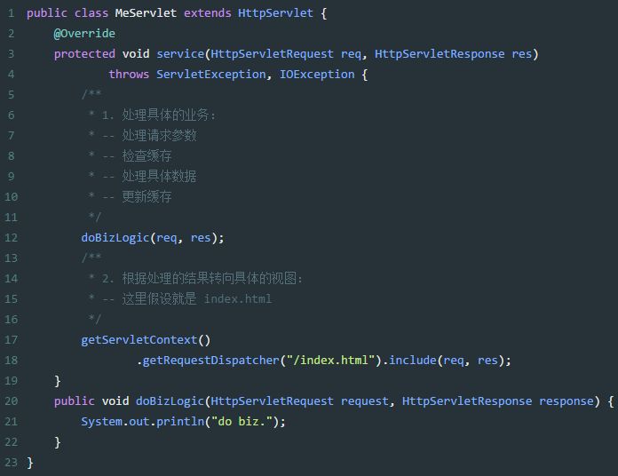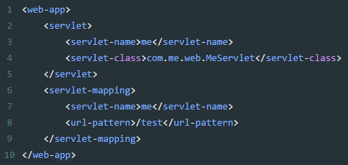 在这个例子中,我们请求一个控制器(MeServlet),然后转向一个视图(index.html),为了简单起见,web.xml中将只有这个servlet的配置: