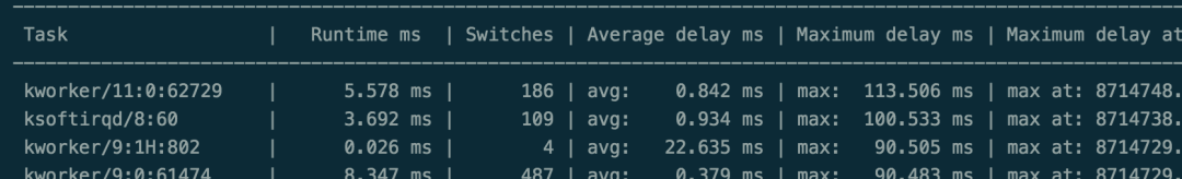 perf看调度延迟,如图5所示,调度延迟比较大但并没有集中在最后四个核上,完全无规律,同样turbostat依然观察到TSC的频率在跳动。
