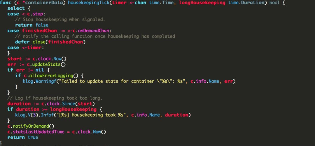 到这里,我们怀疑这些LOG的行为可能指向了问题的根源。查看k8s代码,可以知道在获取时间超过指定值longHousekeeping (100ms)后,k8s会记录这一行为,而updateStats即获取本地的一些监控数据,如图8代码所示: