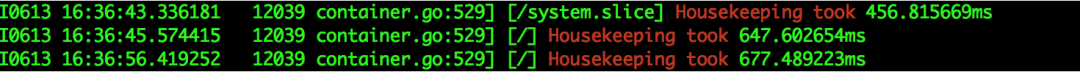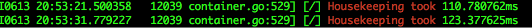 这样我们基本可以确定kubelet的某些行为导致了宿主机卡顿和实例超时,对比正常/非正常的宿主机kubelet日志,每秒钟都在获取所有实例的监控信息,在非正常的宿主机上,会打印以下的日志。如图6所示: