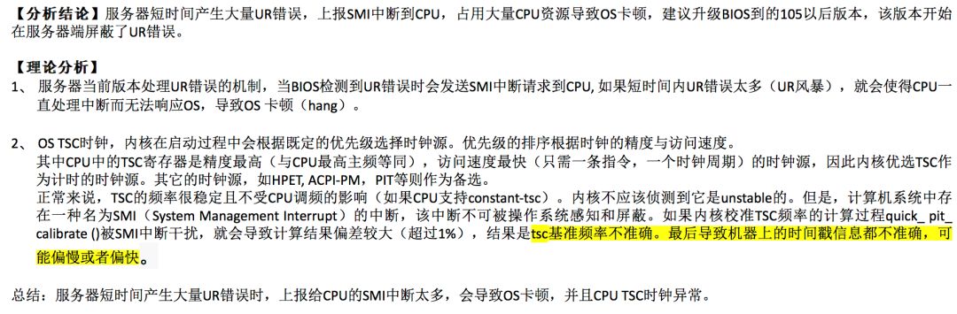 由此我们怀疑这是另一种全新的故障,最重要的是我们将某台宿主机所有业务完全迁移掉,并关闭所有可以关闭的进程,只保留内核的进程后,TSC依然不正常并伴随肉眼可见的卡顿,而这种现象跟之前DBA那台物理机卡顿的问题很相似,这告诉我们很有可能是硬件方面的问题。