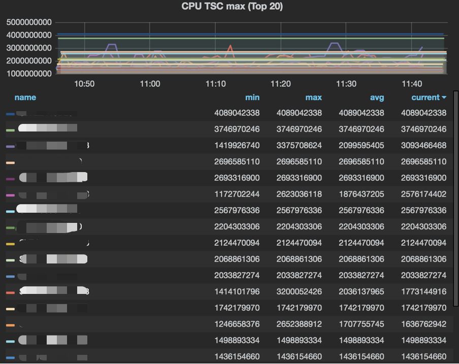 从以往的排障经验来看,TSC抖动程度对于我们排查宿主机是否稳定有重要的参考作用。这时我们决定将TSC的检测程序做成一个系统服务,每100ms去取一次系统的TSC值,将TSC的差值大于指定值打印到日志中,并采集单位时间的异常条目数和最大TSC差值,放在监控系统上,来观察异常的规律。如图10所示。