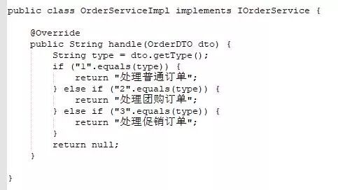 这里虚拟一个业务需求,让大家容易理解。假设有一个订单系统,里面的一个功能是根据订单的不同类型作出不同的处理。