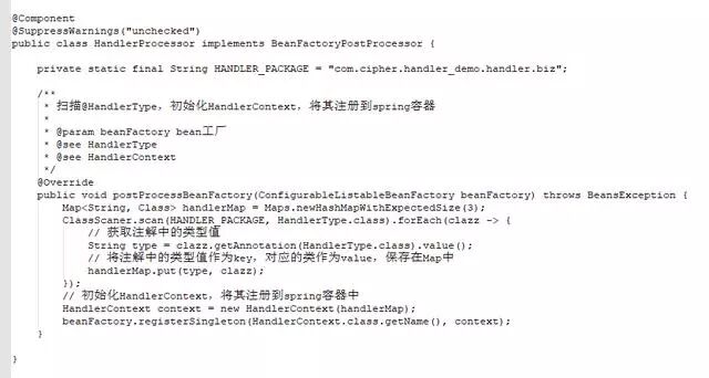 HandlerProcessor需要实现BeanFactoryPostProcessor,在spring处理bean前,将自定义的bean注册到容器中。