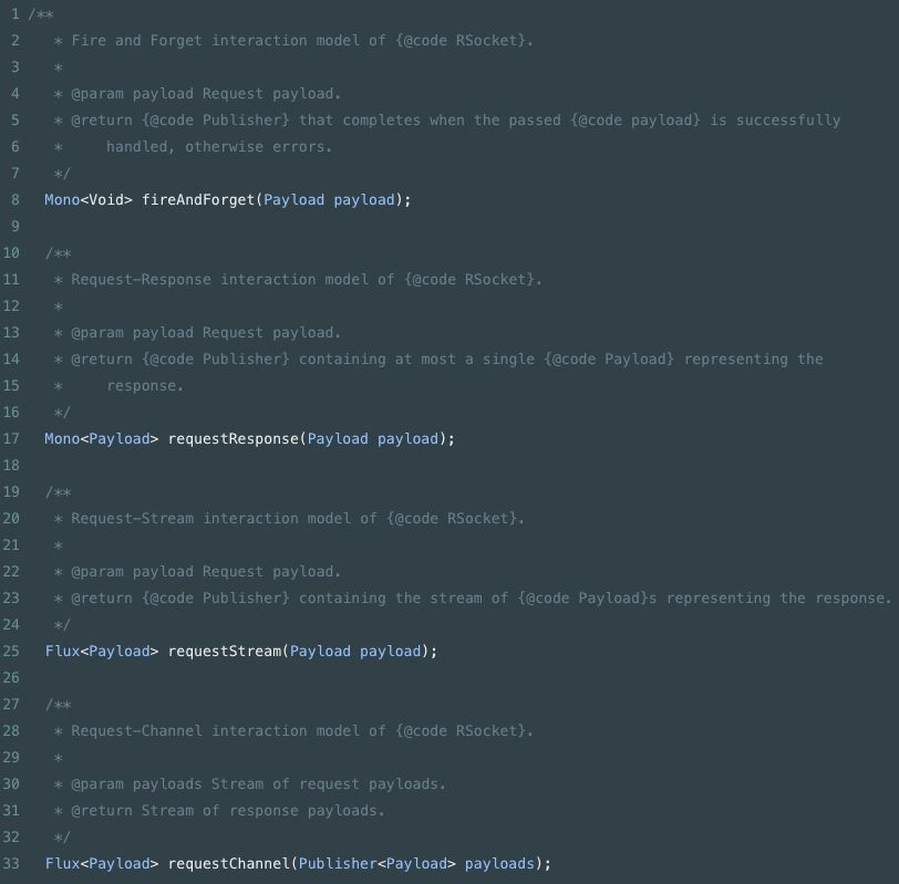 dubbo 基于 RSocket 实现了 reative 支持。RSocket 将 reative 语义的复杂逻辑封装起来了,给上层提供了简洁的抽象如下: