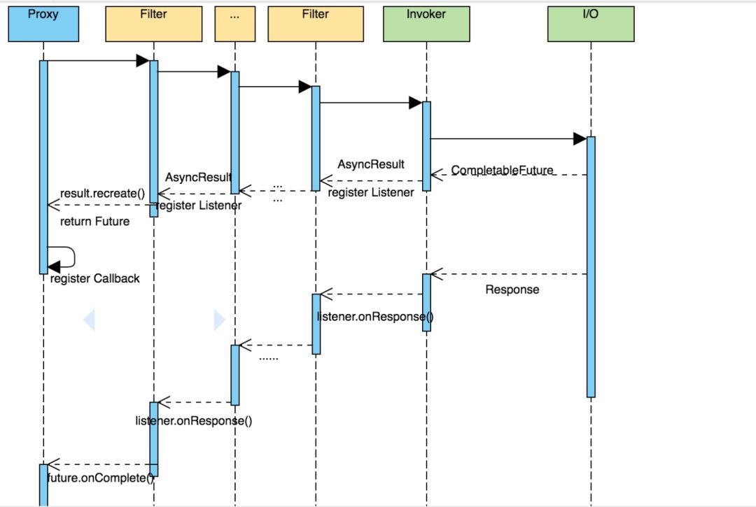 同步调用和异步调用基本上是一致的,并且也是走的回调模式,只是在链路返回之前做了一次阻塞 get 调用,以确保在收到实际结果时再返回。Filter 在注册 Listener 时由于 Future 已处于 complete 状态,因此会同时触发回调 onResponse()/onError()。
