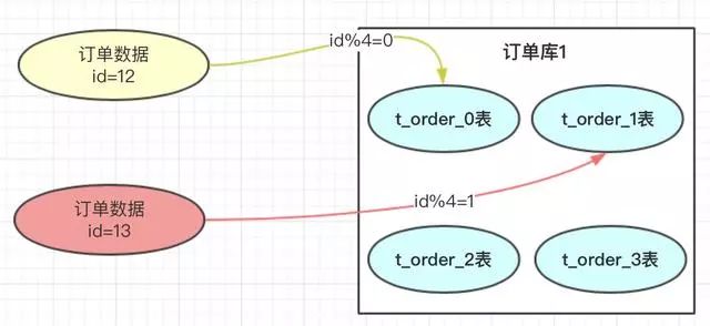 那具体如何路由存储的呢?hash的方案就是对指定的路由key(如:id)对分表总数进行取模,上图中,id=12的订单,对4进行取模,也就是会得到0,那此订单会放到0表中。id=13的订单,取模得到为1,就会放到1表中。为什么对4取模,是因为分表总数是4。