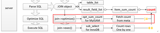 • 共性:共性存在于 SQL 层,即 SQL 解析之后的数据结构是一致的,count 变量都是存在于作为结果列的 Item_sum_count 类型对象中;返回给客户端的过程也类似 – 对该 count 变量进行赋值并经由 MySQL 通信协议返回给客户端。