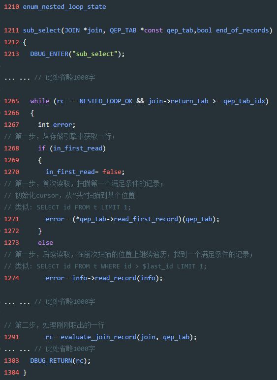 上层的流程与代码是比较简单的,集中在 sub_select 函数中,其中 2 类函数分别对应于前面”执行框架”部分所述的 2 个步骤 – 读取、计数。先给出结论如下: