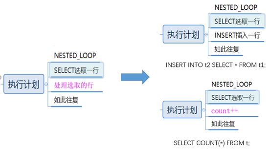 • 区别:InnoDB 的 count 值计算是在 SQL 执行阶段进行的;而 MyISAM 表本身在内存中有一份包含了表 row_count 值的 meta 信息,在 SQL 优化阶段通过存储引擎的标记给优化器一个 hint,表明该表所用的存储引擎保存了精确行数,可以直接获取到,无需再进入执行器。