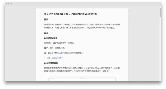 提供与Safari阅读模式功能一致的插件,浏览文章页时候可进入友好的阅读模式,并自定义阅读功能。