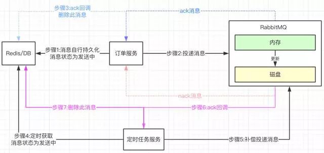 (5)定时任务会作补偿性的投递消息。这个时候如果MQ回调ack成功接收了,再把Redis中此消息删除。