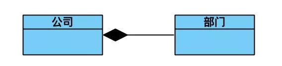 组合关系用一条带实心菱形箭头直线表示,与聚合关系一样,组合关系同样表示整体由部分构成的关系,不同之处在于整体和部分是强依赖关系,如果整体不存在了,部分也不复存在。如图为例,如果公司倒闭了,那么何来部门呢?