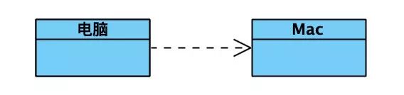 依赖关系是用一套带箭头的虚线表示,他通常描述一个对象在运行期间会用到另一个对象的关系。如图为例码农只有在工作的时候才会用到 Mac 电脑,所以这种依赖关系是依赖于运行状态的。通常情况下是在程序里面通过构造函数、形参等体现。