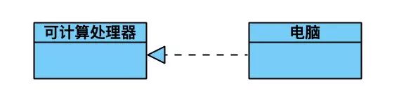 实现关系用一条带空心箭头的虚线表示。如图为例,电脑和可计算处理器就是实现关系,通常程序里面实现关系表现为继承抽象类。比如我们平时写的 Readable,Printable等接口的实现。