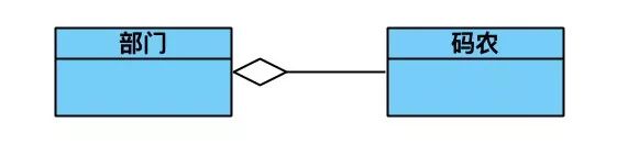 聚合关系用一条带空心菱形箭头的直线表示,如图码农和部门就是聚合关系。与组合关系不同的是,整体和部分不是强依赖的,即使整体不存在了,部分仍然存在。如图为例, 部门撤销了,码农换一个工作还是码农嘛。
