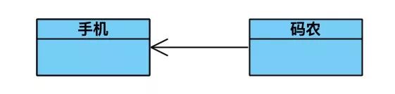 关联关系通常用一条直线表示,当然如果需要标明方向可以添加箭头。它是描书不同的类对象之间的关系,通常不会随着状态的变化而变化,可以理解为被关联者属于关联者的一部分。如图为例,手机就是码农的一部分,不会因为他上班与否而变化所属关系。通常情况在程序里面以类变量的方式表现。