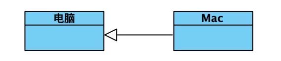 泛化关系用一条带空心箭头的直接表示。如图为例, Mac 和电脑就是泛化关系,通常在程序里面泛化表现为继承于非抽象类。
