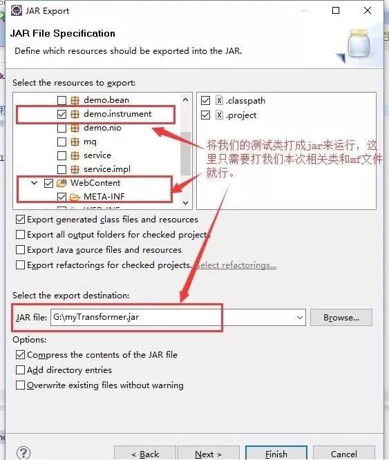 大家看到执行结果的截图中,cmd界面下运行javaagent参数时指定了一个myTransformer.jar,这个jar是我们自己需要打出来的,可以直接使用eclipse具体步骤如下图所示,注意图中说明: