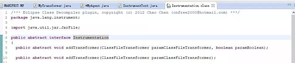这个接口提供了很多方法,我们主要注意一个方法即可,即:addTransformer方法,它的作用就是把一些ClassFileTransformer注册到JVM内部,接口如图所示: