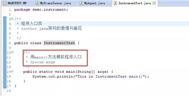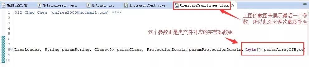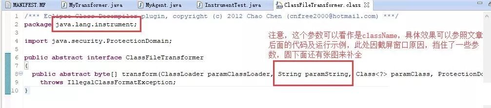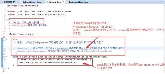 说了这么多,来点干货,下面用代码给大家演示一下如何向JVM中注册转换器实现AOP的。为了方便大家阅读,重要的说明笔者已经写在代码的注释上或者图片空白处,大家注意查看。