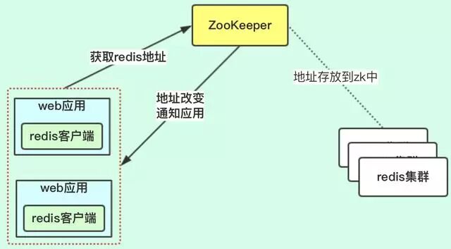 我们可以采用把Redis的集群地址配置在zookeeper中,应用在启动的时候,获取zk上的集群地址的值,进行初始化。如果想要改变集群地址,要在zk上面进行设置。