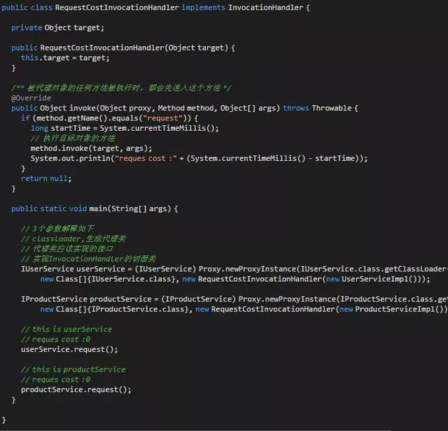 让我们用动态代理来改造一下上面记录系统响应时间的功能。虽然要为IUserService和IProductService两种服务提供代理对象,但因为代理对象中要添加的横切逻辑是一样的。所以我们只需要实现一个InvocationHandler就可以了。代码如下