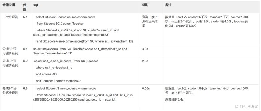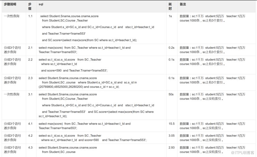 接下来我会分别造数据:1千万选课记录(一个学生选修2门课),造500万学生,100万老师(一个老师带5个学生,挺高端的吧),1000门课,。用上面查询语句查询。其中sc表我测试了下有索引和没有索引情况,具体见下表。再接下来,我会造1亿选课记录(一个学生选修2门课),5000万学生,1000万老师,1000门课。然后分别执行上述语句。最后我会在oracle数据库上执行上述语句。
