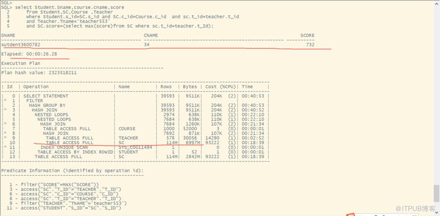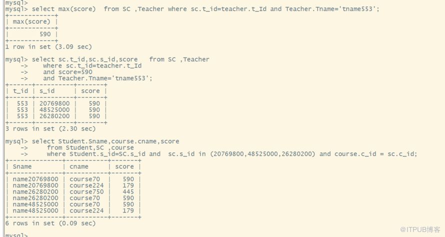 实验是为解决一个问题的:查询选修“tname553”老师所授课程的学生中,成绩最高的学生姓名及其成绩。查询sql是: