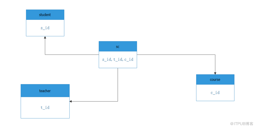 我概述下我的实验:有4张表,student学生表,teacher老师表,course课程表,sc中间关系表,记录了学生选修课程以及分数。具体sql脚本,看文章结尾,我附上。中间我自己写了造数据的脚本,也在结尾。