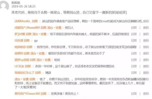还有程序员比较生动的解释了,“屎山”是如何形成的:“就像几百个人堆积木。堆得歪歪扭扭,摇摇晃晃,乱七八糟,你千万不能抽里面的积木,指不定抽了一块就塌了。只能看见哪里觉得不牢靠不停的往那边填积木。只要不倒就好了。”也有网友道出了自己的心酸:“我说为什么有的游戏一直不更新,原来是改不了!”