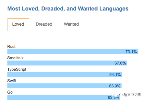 “2017年 Stack Overflow 调查”也显示了 Go 的受欢迎程度的提升。 Stack Overflow 对 64,000 名开发人员的综合调查试图通过询问“最受欢迎,最令人生厌,最期待的语言”来获得开发者的偏好。 这个清单是由较新的语言,例如 Mozilla 的 Rust、Smalltalk