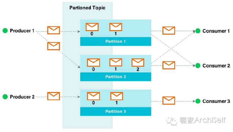 Figure 1-6 给出了订阅-发布架构的高层视角,消息在broker传输,服务于分区的话题。
