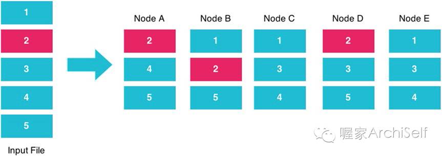 Figure 1-3 展示了HDFS中的数据如何在 一个集群的五个节点中复制的。