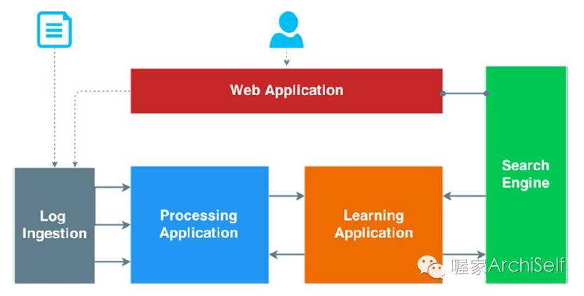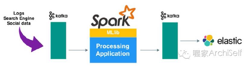 Figure 1-10 展示了该机器学习应用如何使用Kafka 接收数据,然后发送给Spark 处理,最后在ElasticSearch 建立索引为将来使用做准备。