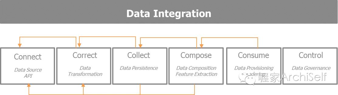 集成层专注于数据的获取、转移、质量、持久化、消费和控制。基本上由以下的5C来驱动: connect, collect, correct, compose和consume.这五个步骤描述了数据的生命周期。它们聚焦于如何获取有兴趣的数据集、探索数据、反复提炼使采集的信息更丰富,为数据消费做好准备。因此, 这些步骤执行如下的操作: