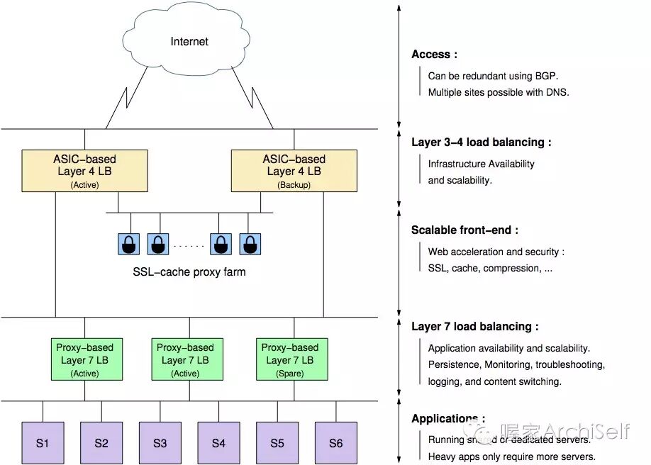 SSL 属于应用层的协议,所以只能在 7 层上来做,而 HAProxy 也是支持 SSL 协议的,所以一种方式是只需简单的让 HAProxy 开启 SSL 支持完成对内解密对外加密的处理, 但引入 SSL 处理是有额外的性能开销的(如上面谈到的认证), 所以 一般采用SSL proxy farm, 典型的架构如下: