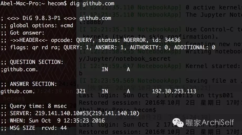 DNS会将域名映射为IP地址,反之亦然。所有核心DNS服务器都是集群,用的最多的DNS服务器大概就是BIND了。查询DNS服务器时,推荐使用dig;查询DNS解析时,推荐使用nslookup。 使用DNS缓存可以提高DNS解析的性能。Dig 在mac上的使用示例如下: