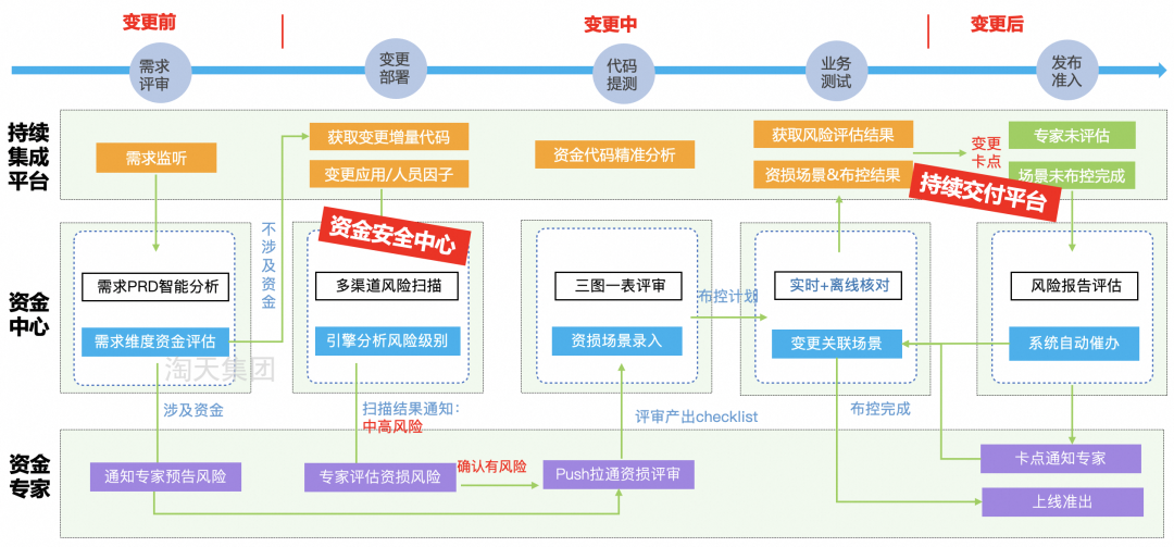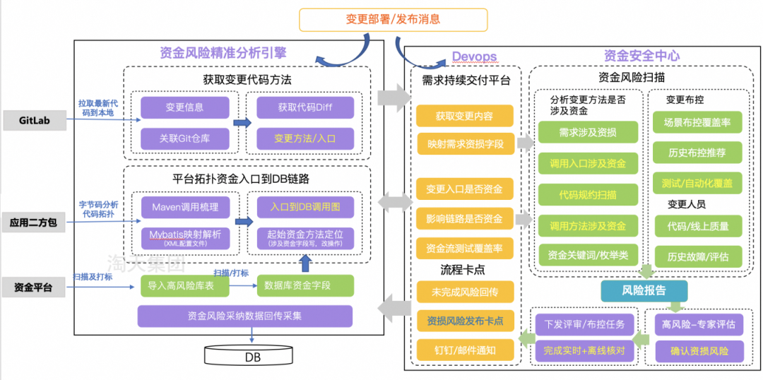 往细剖析了一下,在资金安全引擎中,我们实现了变更代码的资金风险精准分析,并且把风险识别和卡点到了研发流程中,首先利用系统上资金字段的沉淀,通过字节码分析代码拓扑资金入口,到资金方法,再到资金DB字段的链路调用图,来扫描识别变更代码diff中是否改动到该资金链路,然后再把这部分结果数据纳入风险评估引擎,实现变更资金风险的精准识别,一直到现在,这套流程还运行的非常好。