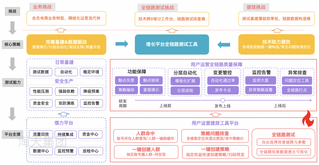 摸清了全链路痛点,接下来就简单了,对症下药即可,我们通过数据驱动&基建完善,让新触点验证从3天缩短到0.5天,策略曝光率提升20%。同时推动研发模式升级和测试左移,让自动化发现Bug率提升10%,保障线上0故障。另外针对运营全链路配置难&排查难的问题,由点到面搭建全链路测试工具,可实现每月提效10+人日。从下图可见,一个符合业务特性的精细化用户运营质量保障体系