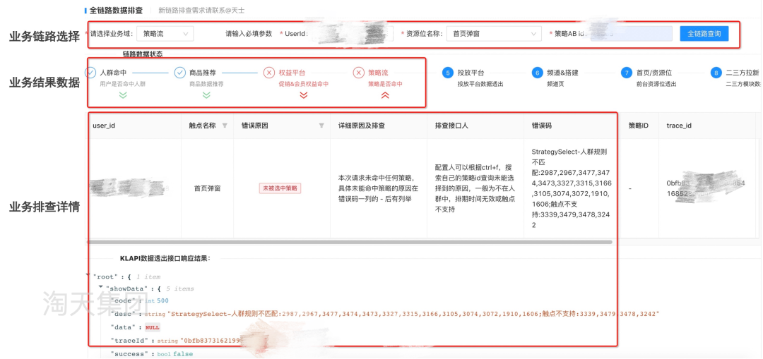 ,用户可自由选择业务链路,进行链路节点可视化串联,支持按域快速排查与定位问题,针对异常节点明确标识 ,同时有可读性强的异常错误原因&解决方案,也能看到接口数据透传详情,让不熟悉上下游链路的运营&PD&产技同学也可无门槛进行自查,策略无法透出原因一查便知,排查时间可降低95%。