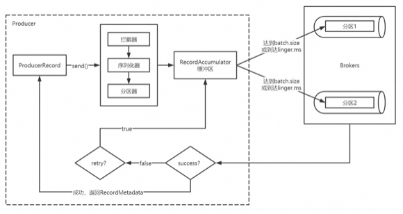 1. 生产的消息先经过拦截器->序列化器->分区器,然后将消息缓存在缓冲区。