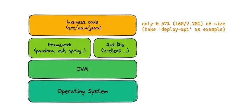 作为类比,软件研发也涉及供应链管理的问题。虽然开发者在大多数时间的工作都集中在增量价值(如 Maven 项目中 src/main/java 的部分)的开发,但是软件要运行起来,还依赖大量的下层软件模块,包括操作系统,JVM,基本的框架、中间件,以及大量的内部二方库。以一个 Java 应用 deploy-api 为例,它的镜像大小接近 3 GB,但是这其中真正属于增量价值部分的大小仅仅只有几十M,从文件大小来看,占比不到 1%。