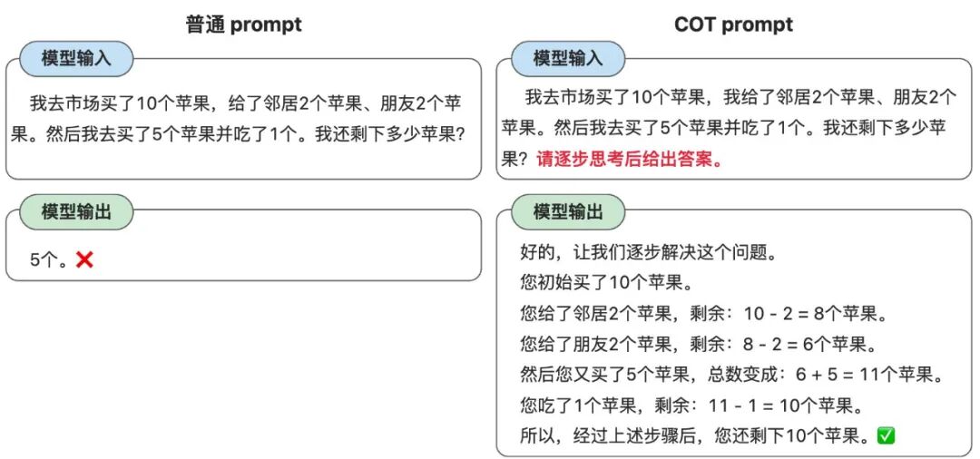 链式思考允许模型将问题分解为多个中间步骤,模型会解释它是如何得到答案,并有机会修正推理步骤中出错的地方。