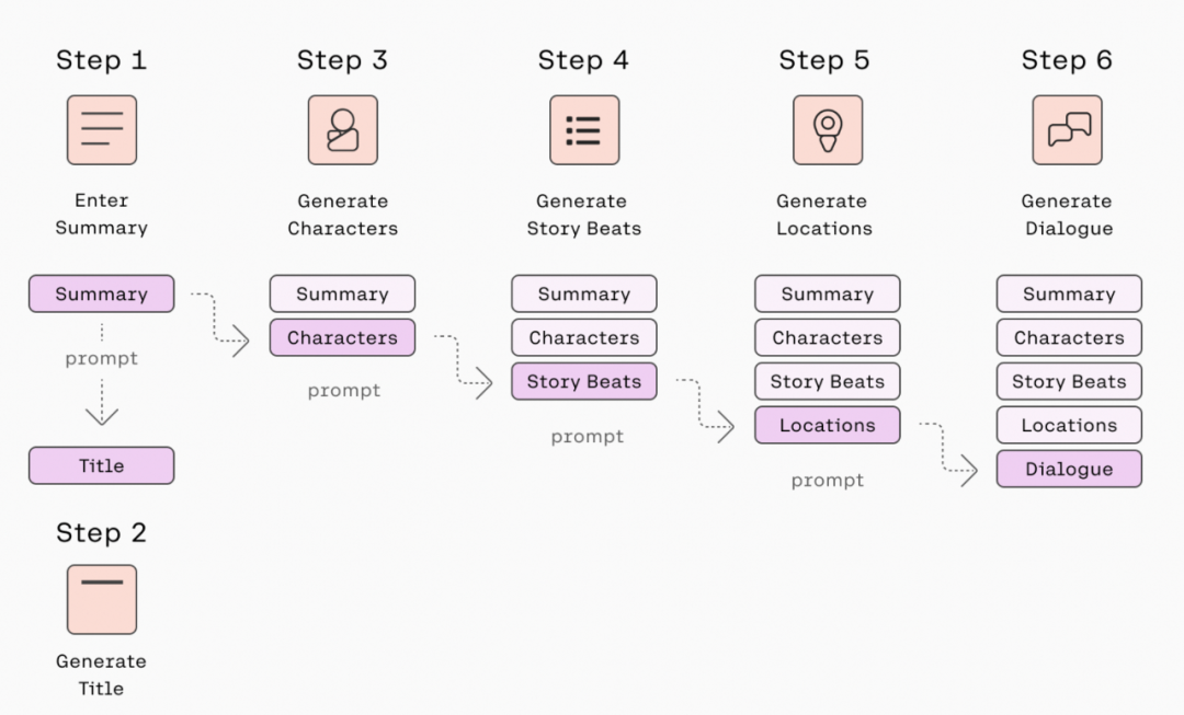 Prompt Chaining,链式提示。对于一个复杂问题,一个推理任务是无法解决的。prompt工程可以将一个任务被分解为多个子任务,根据子任务创建一系列提示操作。确定子任务后,将子任务的提示词提供给语言模型,得到的结果作为新的提示词的一部分, 这就是链式提示。下图就是一个故事生成任务的链式prompt,不断使用prompt一步一步生成故事的摘要、题目、人物、地点、对话等。