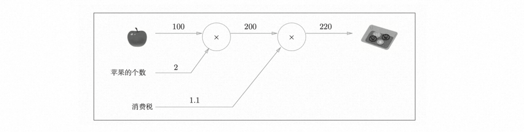 网上找到一个比较形象的例子来说明反向传播:假设现在要购买水果,在我们日常的思维当中这是一件非常简单的事情,计算一下价格然后给钱就完事了,但实际上这个过程可以抽象成一张计算图,当中是包含了若干步骤的。比如下图,看到需要先计算苹果的价格乘上个数,再乘上消费税,最后得到的才是真正的支付额。