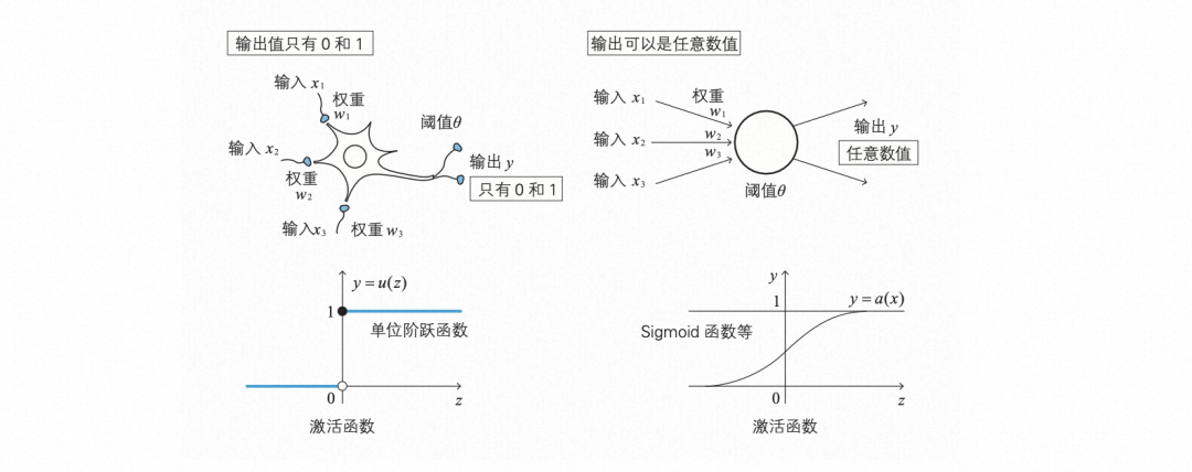 神经网络由多个神经元组成的网络,在模拟生物神经系统的基础上进行信息处理和学习。神经网络的设计灵感来源于人类大脑中神经元之间的相互作用。在神经网络中,每个神经元接收来自其他神经元的输入,并根据输入的权重进行加权求和,然后将结果传递给激活函数进行处理并产生输出。神经网络的学习过程通常通过调整网络中神经元之间的连接权重来实现,使得网络能够根据输入数据进行预测和分类。如下图是神经元的生物和数学两种模型的表示。